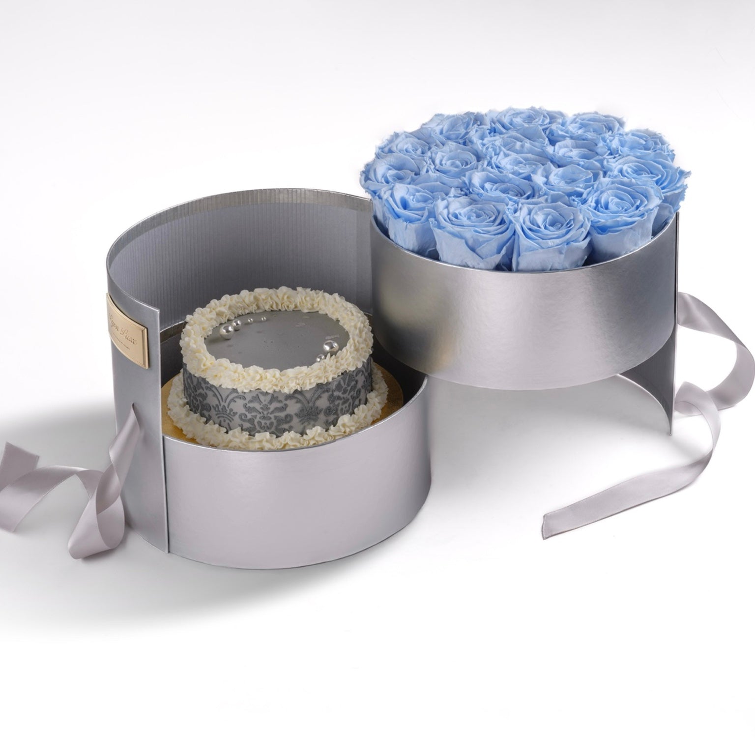 Elegance Bloom is a celebration of understated sophistication. This round box, wrapped in a graceful ribbon, unveils a harmonious pairing: perfectly preserved roses and an exquisite cake. Perfectly balanced, Elegance Bloom is designed to elevate the art of gifting, making every moment unforgettable.