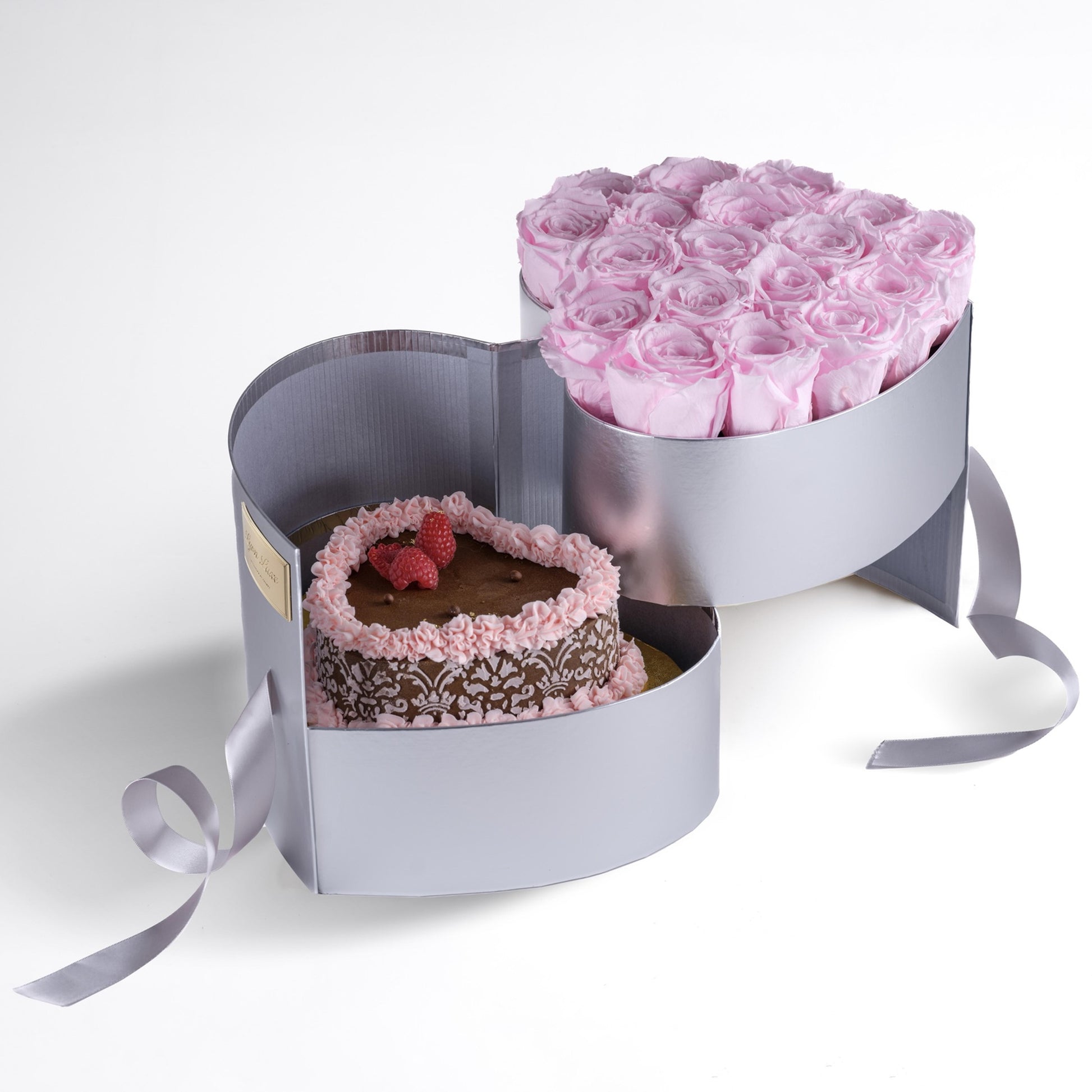 Vibrant and bold, this heart-shaped box features striking bright pink Eternal Roses complemented by our Chocolate Raspberry Opulence cake—a rich chocolate sponge with tangy raspberry compote, designed for unforgettable celebrations.